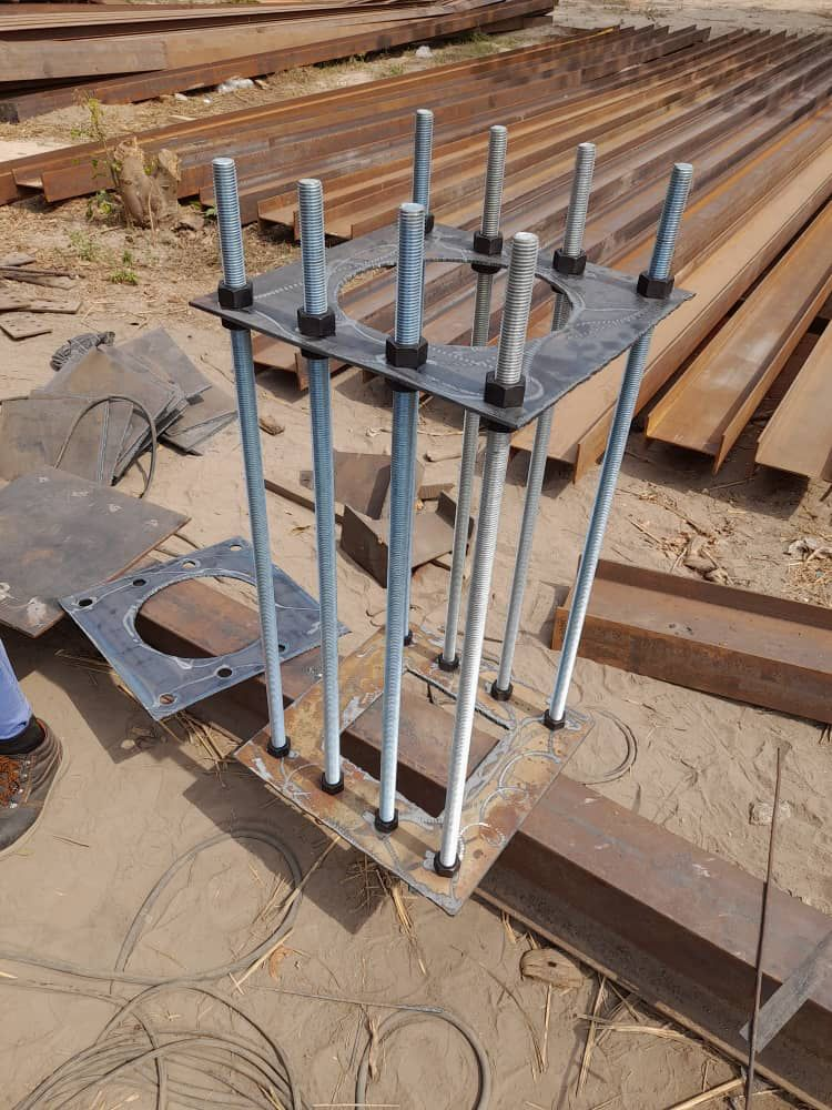 Precision installation of anchor bolts and steel base plates ensuring alignment accuracy and structural stability.